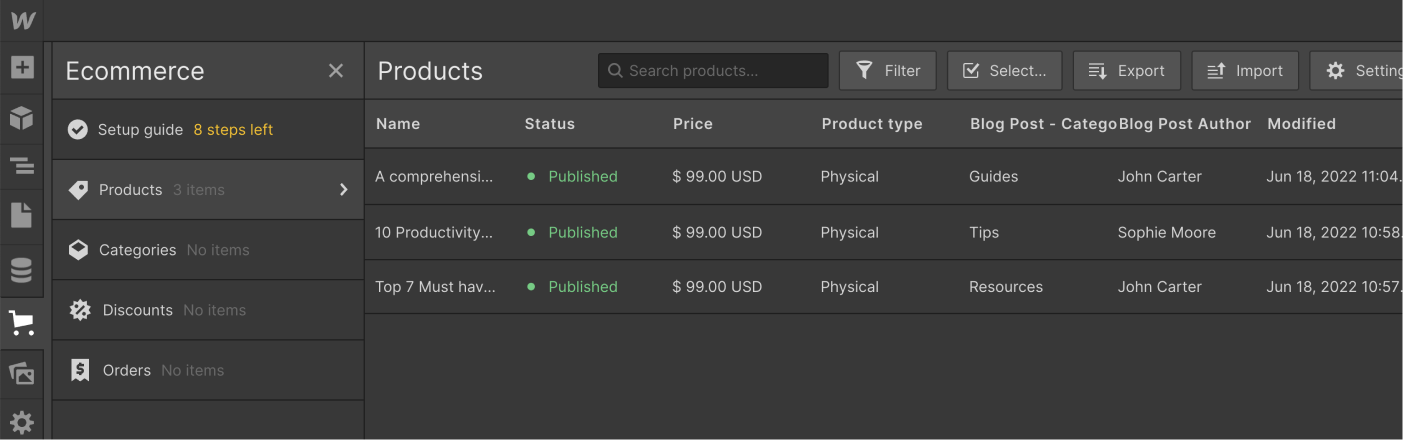 Products or eCommerce content function in a similar way to the CMS dynamic content, however, this is focused exclusively for eCommerce products.